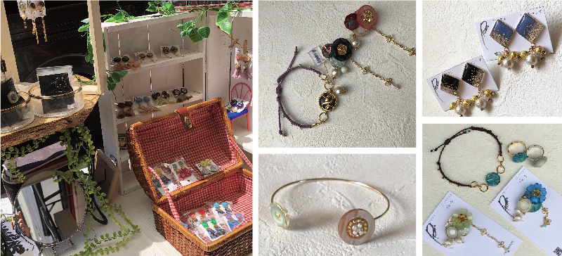 ヴィンテージボタンやビーズなど素材がいきるように、雰囲気や色合わせを考え丁寧に仕立てています。 シンプルなものから素材の可愛さをいかしたものまで、身につけると嬉しくなるようなアクセサリーを是非手に取ってみてください。