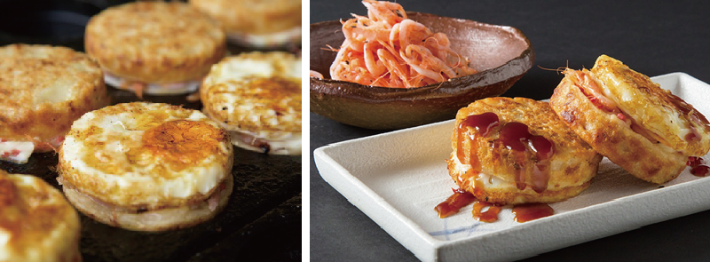 片手で食べられるお手軽フード「おこたま」です! お好み焼きと目玉焼きのコラボが絶妙♪ おみやげにもGood!